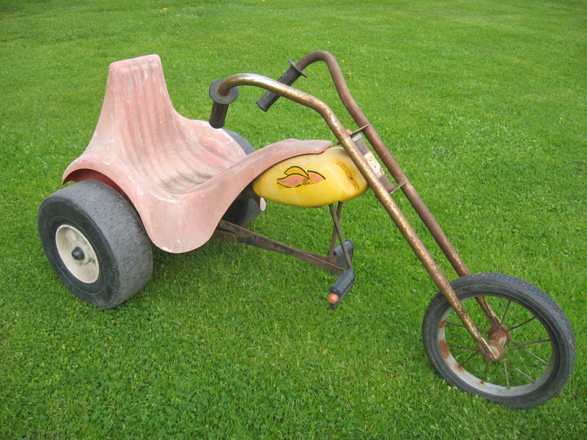 Bikes were a huge deal when I was growing up.  My very first bike was a sky blue two wheeler with hard, twelve inch tires, a white seat and an orange alligator decal on the chain guard.  Another bike I had was a three wheeled chopper.  The huge orange seat was molded around the two oversized rear plastic wheels and the extended chrome front end was a thing of beauty.